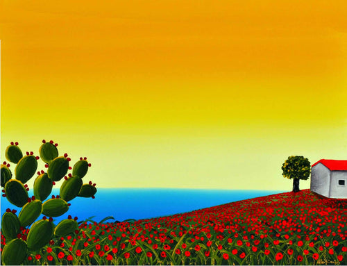 Suggestivi paesaggi siciliani dai toni caldi e vivaci che si fondono in mille sfumature differenti, oltre il mare, al di là di ogni immaginazione. Autrice Amanda Marini